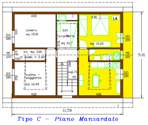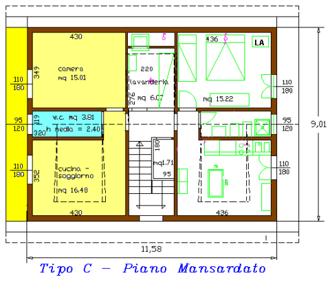 Con questa tipologia mansardata abbiamo disponibile 1 appartamento (situato al piano mansardato), composto da entrata - pranzo-soggiorno con angolo cottura, camera molto ampia, bagno, terrazza ed ha il portoncino blindato di accesso.